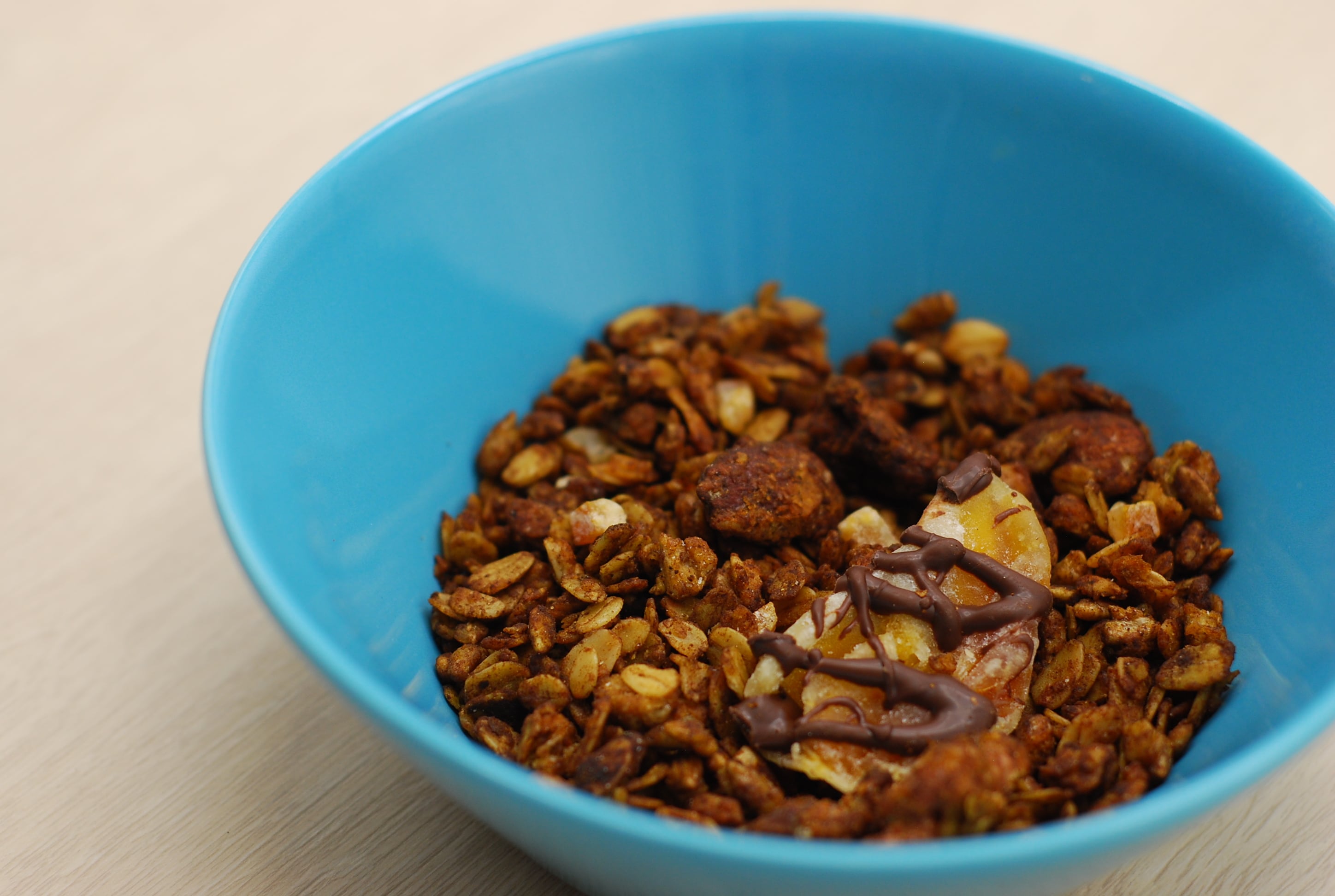 原材料名:オートミール、蜂蜜、ひまわりの種、小麦全粒粉、米油、ドライオレンジ、アーモンド、くるみ、チョコレート、紅茶、塩/香料、乳化剤、酸味料(クエン酸)、保存料(亜硫酸塩)